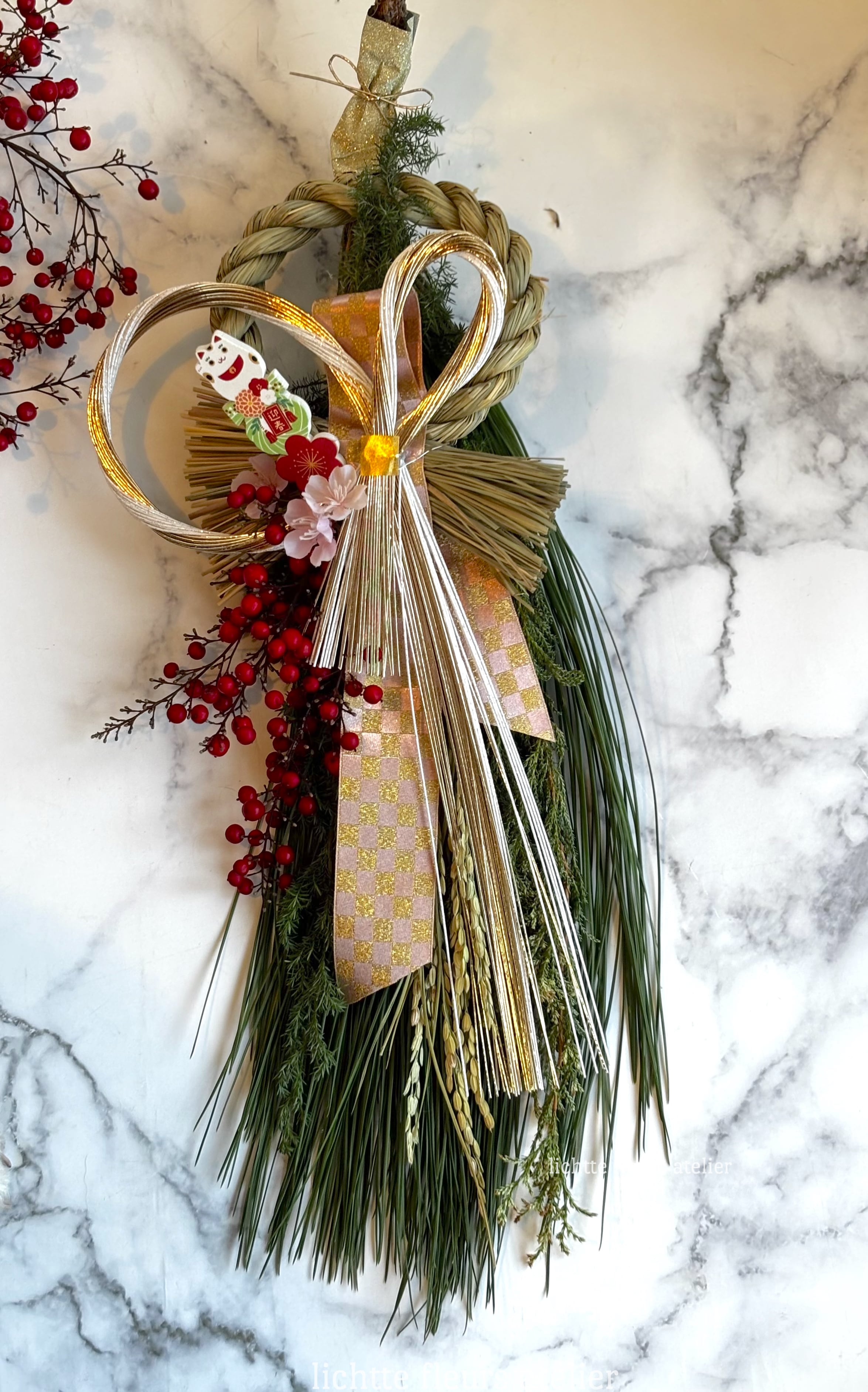 大王松のしめ縄飾りは、縁起物として広く親しまれており、その風合いと色合いは、見る人に安らぎと心温まる思いを届けます。新年や特別な日の飾りとして、また、お祝い事やお礼の気持ちを込めて贈り物にも最適です。