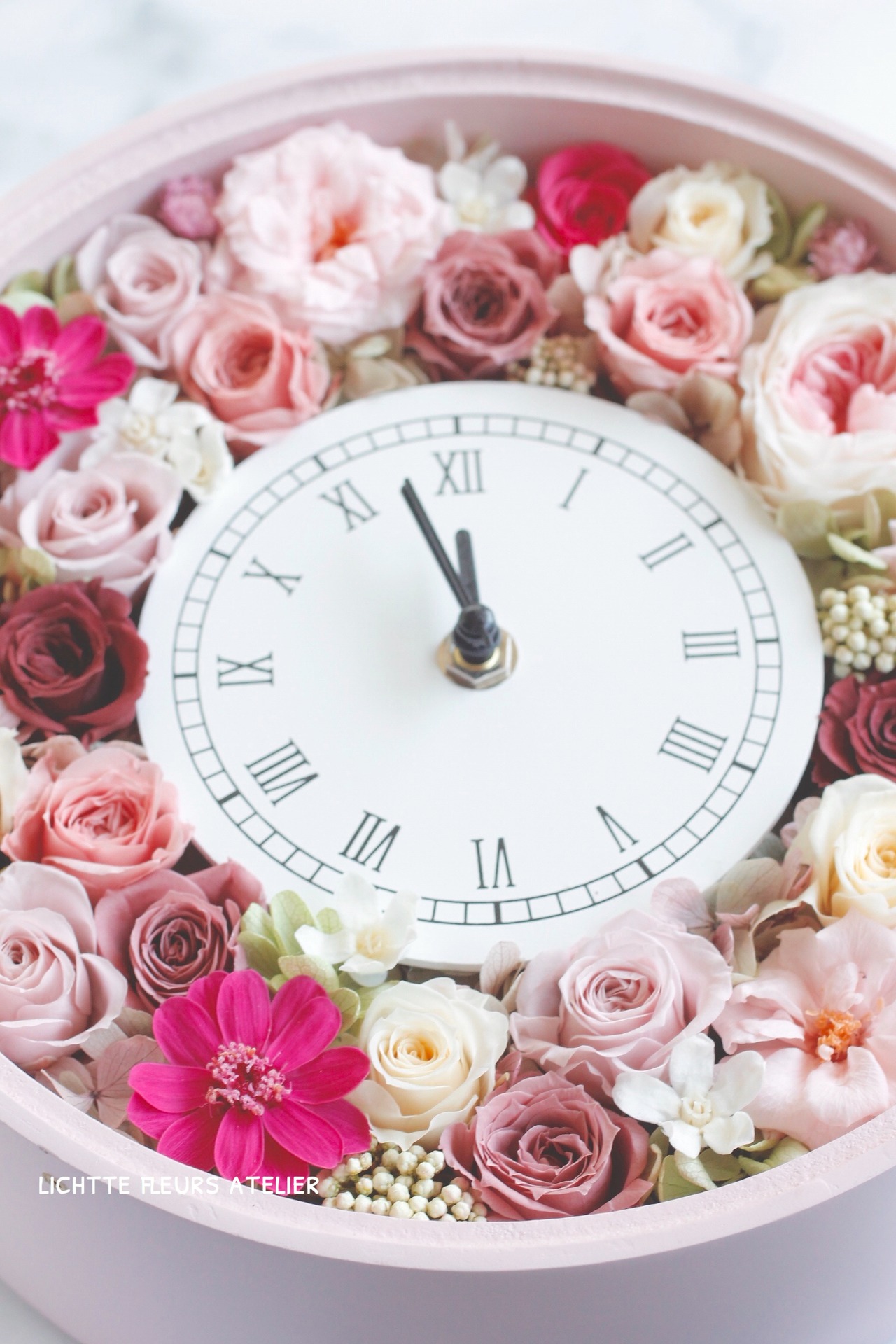 ほんのりパウダリーなピンクの丸時計に柔らかくナチュラルなプリザーブドフラワーをぎゅっと閉じ込めました。