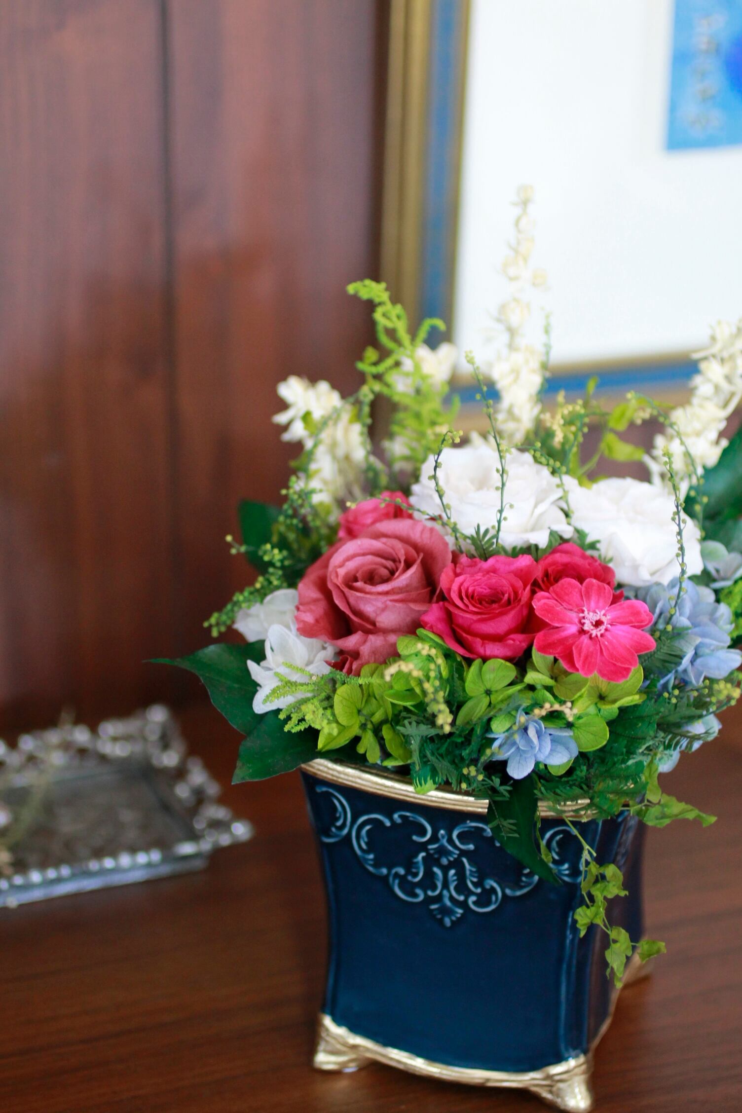 ◆花材:バラ・ジニア・アジサイ3種・ラクスパー・アカシア・ローズリーフ他
